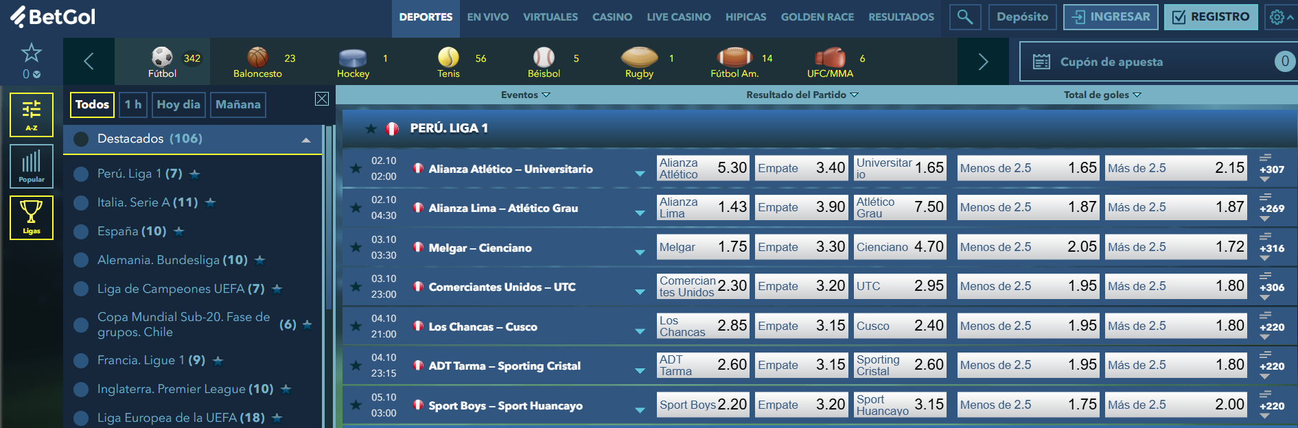 El fútbol peruano es el corazón de las apuestas en BetGol. Encontrarás mercados en: